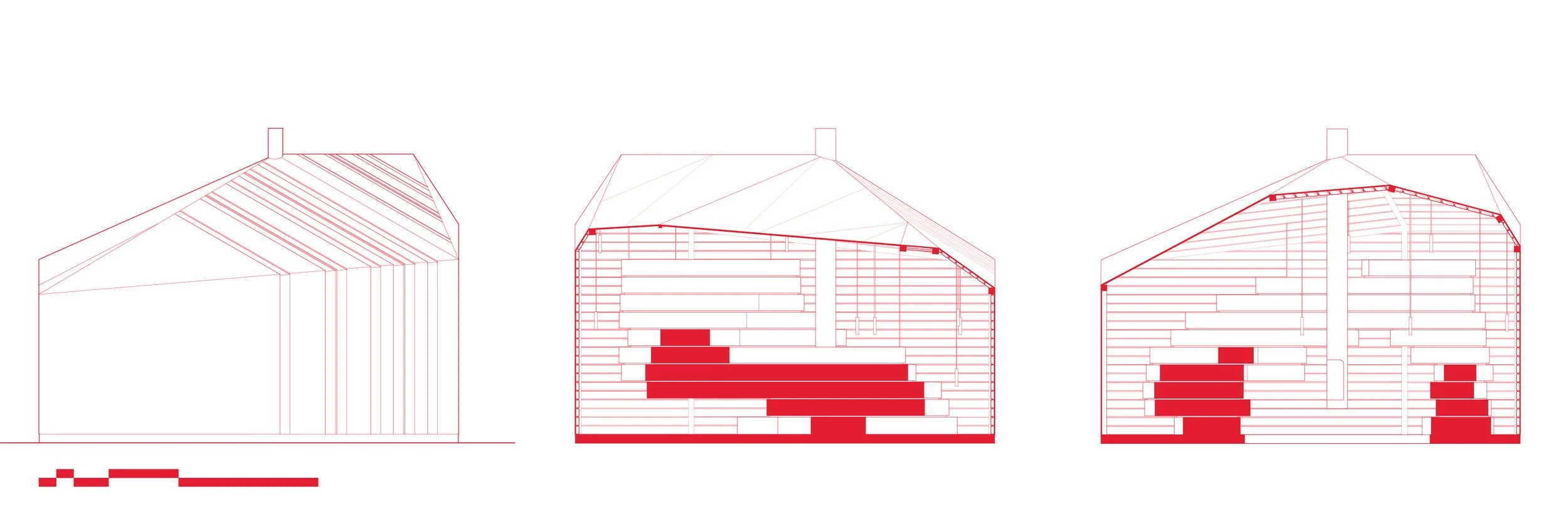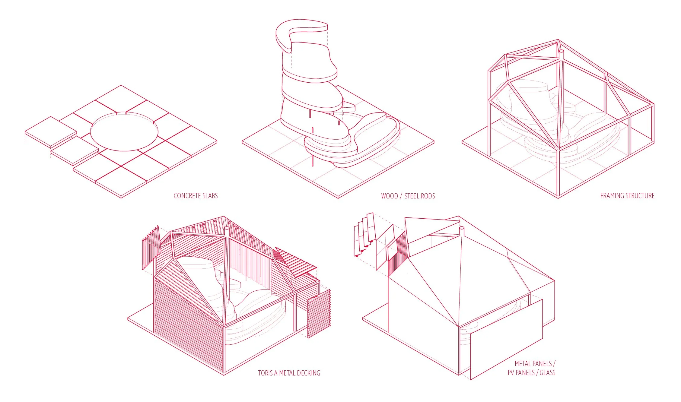 The earth is represented by an organic mass of tiered wood, a material choice which feels solid and warm. The form wraps around the hearth space, at which the foundation gives away to exposed earth, purposefully at the lowest and warmest point in the building.
